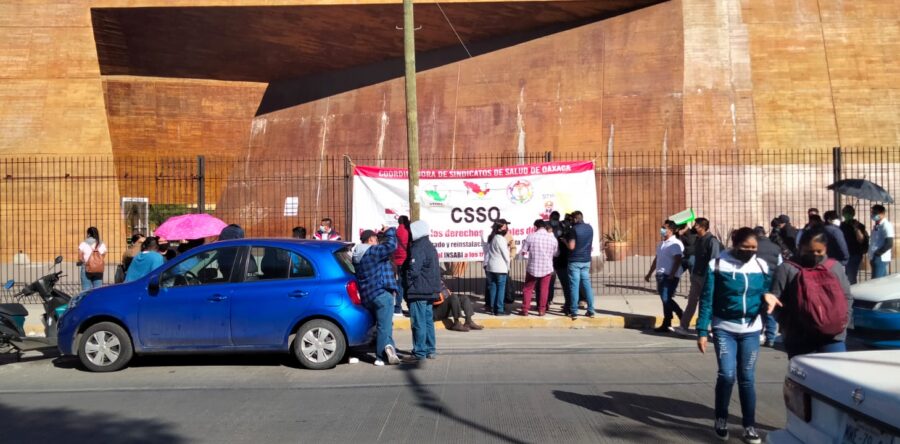 Integrantes de la Coordinadora de Sindicatos de Salud de Oaxaca protestaron en el Centro Cultural y de Convenciones de Oaxaca (CCCO), para exigir transparencia en la elección de personal médico para el Instituto de Salud para el Bienestar (INSABI).