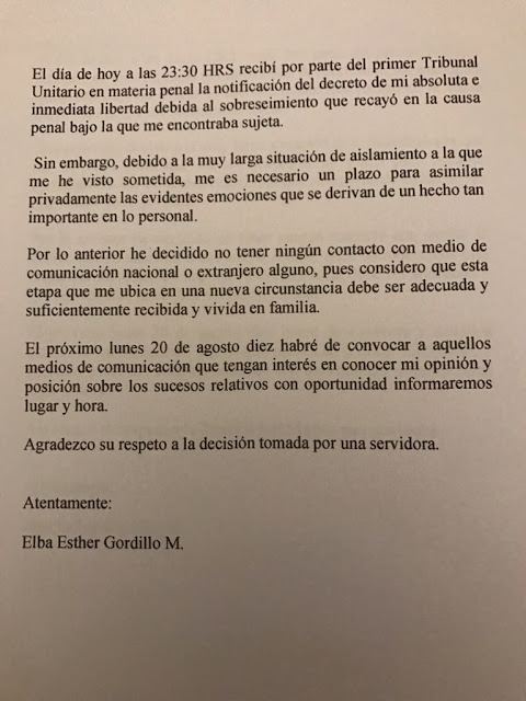 Según la carta, Gordillo ya se encuentra con su familia y será hasta el 20 de agosto cuando ofrezca una conferencia de prensa, en la cual dará a conocer su opinión y posición sobre el injustificado encierro al que fue condenada. Con oportunidad informaremos lugar y hora".